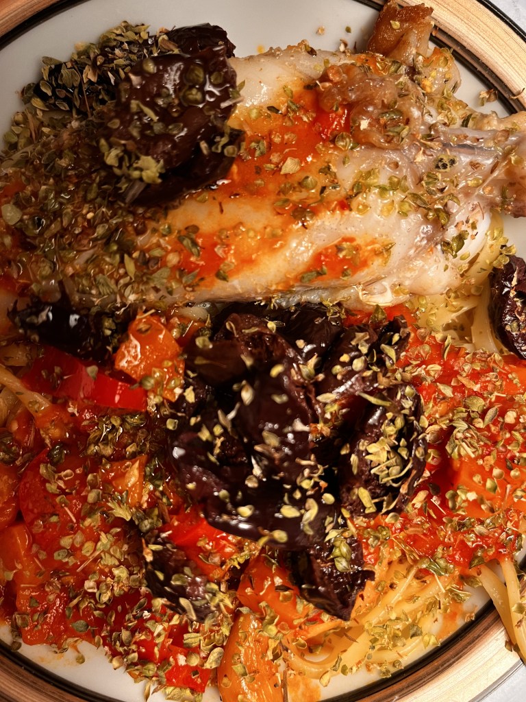 Aslında tarifler hep aynı. Her içerik ayrı pişecek, hiçbiri dokusal özelliklerini kaybetmeyecek, sonunda birleştireceksin ve mümkün ise tuz, şeker ve acı gibi ilaveleri doğal ürünlerden kullan. Burada da tuz yerine siyah zeytin, baharat olarak Antakya acı biber salçası ve dağ kekiği ile Kastamonu sarımsağının zeytinyağında dinlendirilmiş şekli (Kübra’ya teşekkürler sarımsak için) kullanıldı. Ama her şeyin sırası var. Kübra’nın sarımsaklarını zeytinyağında kısaca kavurduktan sonra 1/4 havuç dilimlerini ve ardından kapya biber doğramalarını(1/4) atıyorsunuz. 1/4 ler doğrama şeklini ifade ediyor. Havuçlar yarı yarıya yumuşayınca Kapya biberlerini ilave edeceksiniz. Ve hepsi kızarınca gerçek domatesi ilave edip altını kısacaksınız. Domates suyunu salacak ve en az 20 dakika sonra iyi bir sos haline gelecek. Bu arada diğer taraftan makarna üreticinin tarif ettiği şekilde hazırlarken bir ilave kapta İskobüt’ünüzü önce mühürleyip sonra yavaşça pişiriyorsunuz. Mühürlemeyi bilmiyorsanız internetten öğrenebilirsiniz. Ama işin aslı şu; etin (balığın) dış duvarını öyle hızlı pişiriyorsunuz ki etin(balığın) içi pişerken su kaybetmiyor. İkinci denemenizde kesin yapabileceksiniz. Sonuçta dışı kızarmış, içi sulu olmalı. Yapamazsanız çağırın beni. Ve tabakta hepsi birleştirilmiş olmalı.