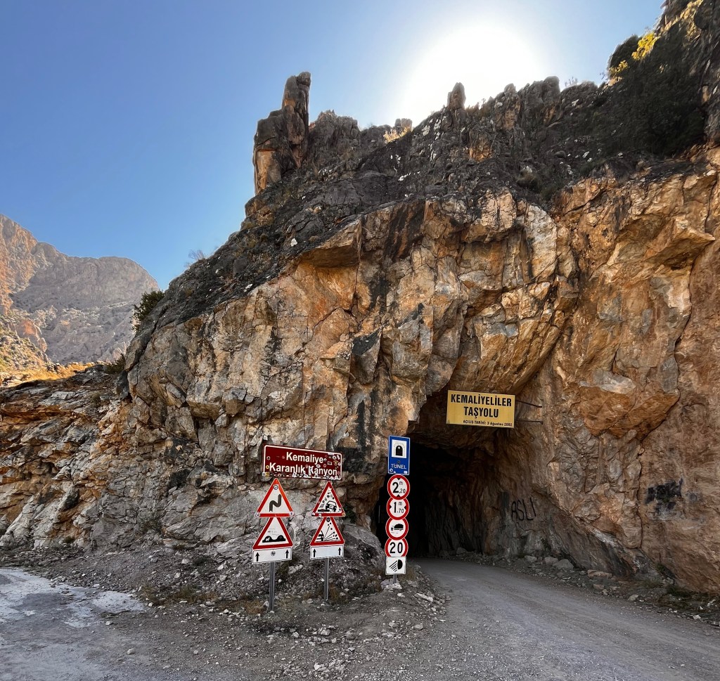 Meşhur Kemaliye Taş yolunun kuzey girişi. Kemaliye güney çıkışında. 132 yılda bitirilen yolda el oyması (iş makinesi olmadan) 54 tünel olduğu söyleniyor. Tünellerin bazılarında isimler yazılı. Yazılı isimler tünelin yapılmasında maddi katkısı olanların. Ben tünelleri saymadım ama girişteki trafik uyarıları sanki buraya girme der gibi. Yolu Vali Recep Yazıcıoğlu tamamlamış. Buralarda Recep bey son derece seviliyor. Ben de oturup okudum: https://tr.wikipedia.org/wiki/Recep_Yazıcıoğlu Hele orada bir paragraf var ki bir kısmını alıntılamadan edemedim. Siz de okuyunuz: “Kafamız kalıplarla dolu, dogmalarla dolu. Herkesin kendi doğrusu var. Herkes kendine tapıyor. Farklılıkları zenginlik kabul etmiyoruz. Ve devlet, sistem; ideoloji üretiyor. İdeoloji üreten sistemler demokratik sistemler değil, faşist sistemlerdir. Devletin görevi ideoloji üretmek değildir. İdeoloji, kişilerin, grupların, sivil toplumun tercihidir. Devlet hakemdir, devlet teknik devlettir. Devlet hizmet üretir.” Bir de bu satırların hemen üzerinde sağ-sol yorumu var ki tadından yenmez. Ne yazık ki Recep bey 2003 de bir trafik kazasında sınıf arkadaşı Ahmet Kahveci gibi ölmüş.