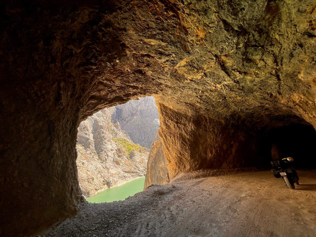 Sayfanın başında tünellerden birinin içini görüyorsunuz, Sanırım havalandırma ve moloz atımı için açılan pencerelerden aşağıdaki Fırat (aslında bir kolu olan Karasu) pek de güzel görünüyor. Yer yer tüneller, yer yer nişler arasından ilerliyorsunuz. Sağdaki fotoğraf tünellerden çıkınca Karasu’nun üzerindeki köprüden çekilmiştir. O dağın içindeki karanlık iz Taşyolu..