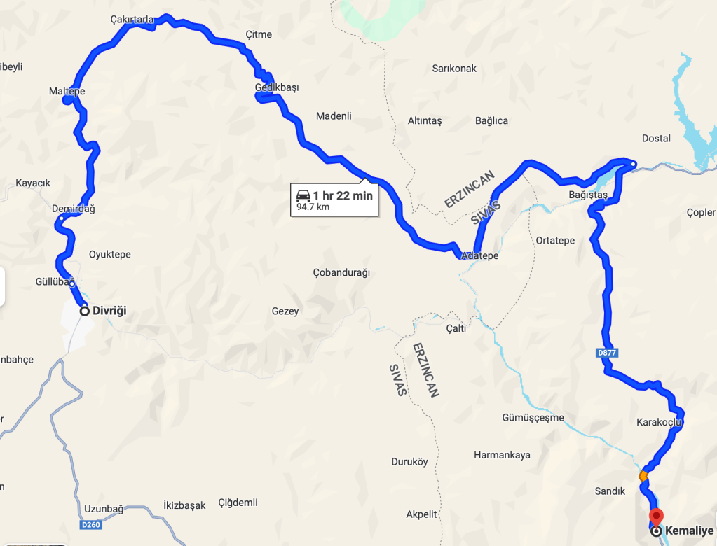 Divriği’den Erzincan yoluna çıkıyorsunuz, Rüya gibi güzel. 1400-1700 arası rakım. Tatlı kıvrımlar kimse yok. Nefis bir yol, kıvrıla kıvrıla dağların zirvesine doğru tırmanıyorsunuz. Tabii geçtiğiniz yerleri de işaretleyerek.