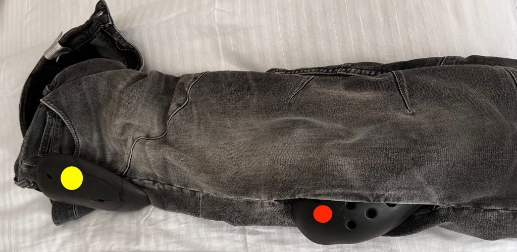 Bu giysiler hassas yerlerde plastik yastıklar içeriyor. Bakın yukarıda pantolon var. Pantolonun içine dikilmiş cepler var ve kırmızı cebe dizinizi koruyacak yastığı, sarıya ise leğen kemiğiniz koruyacak yastığı koyuyorsunuz. Leğen kemiği tercümesini kim seçti ise gülümsememek imkansız. Ama daha iyisini bulamadı herhalde, maşrapa demediğine şükür. Belki de şekli benzediğindendir.