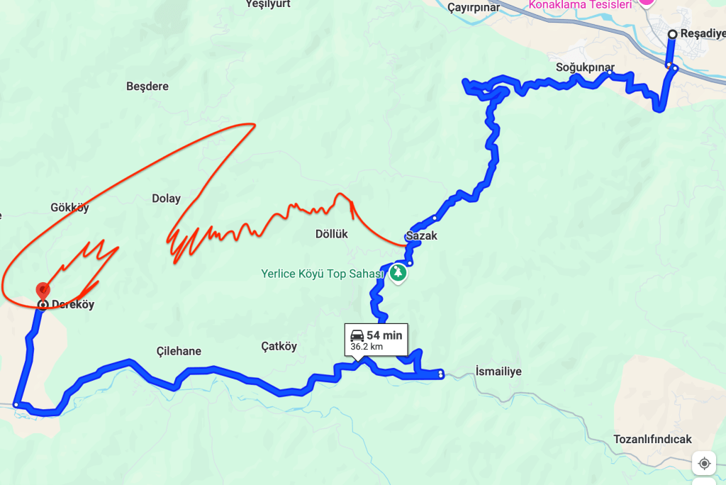 Reşadiye’den sonra 1 saatlik bir yol gibi gözüküyor. Veli bey ısrar ediyor seni Reşadiye’den araba ile karşılayım diye ama ben kendim geleceğim diye inat ediyorum. Yolda bir yerde buluşmaya karar veriyoruz ama ben daha hızlıyım ve onları kaçırıyorum. İki saat motor sürdükten sonra buluşamıyoruz, Çilehane’yi geçtikten sonra geri dönüyorum ve o kırmızı ile gösterilen taş yola girmek zorunda kalıyorum. Kemaliye’den ve Pülümür den kötü ama arkamda Veli bey var ve ayı çıkarsa motoru bırakıp onların arabalarına sığınabileceğim. Düşersem sanırım sahip çıkarlar. Reşadiye den sonra 4 saat daha yol sürmek zorunda kaldım sırf inadım yüzünden. Motoru hayatımda çok düşürdüm. Ancak elbiseleriniz bu düşmenin etkilerini iskelet sisteminize iletmeyecek kadar iyi.