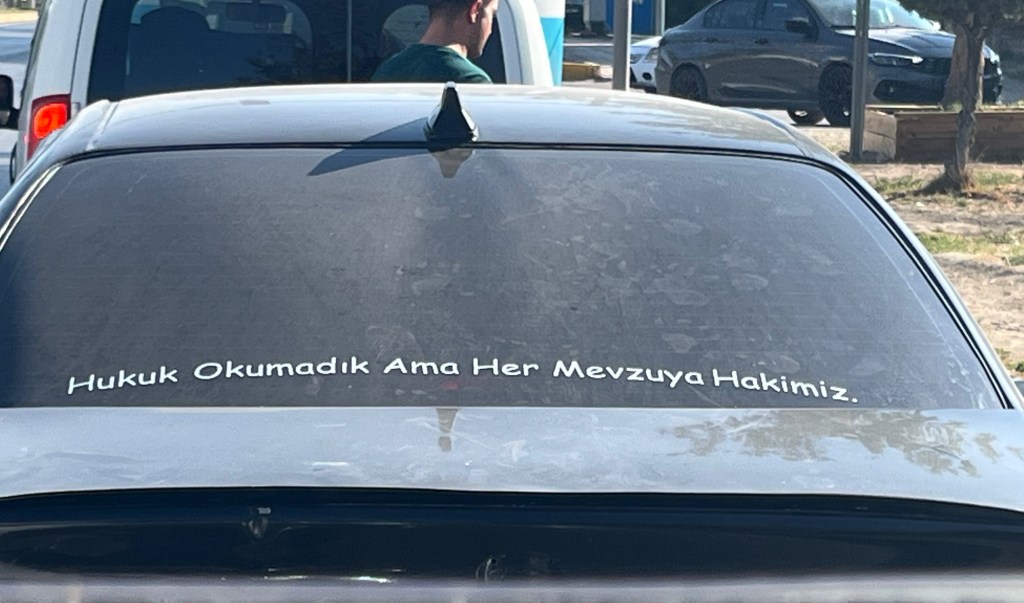 Bir gün önce Van’a vardığımda Bahçesaray yolunun virajlardan yorgun düştüğüm için hiç halim yoktu ve Urartu müzesini sabaha bırakmıştım. Sabah kalkınca da zaten asıl önemli parçaların Ankara Anadolu Medeniyetleri Müzesi’nde olduğunu okuyup yola çıktım. Hani sanmayınız ki her yaptığından emin olan insanlardanım. Van’dan çıkarken bile aklımda binbir düşünce ama şemsiye, zaten burdaydım.. Şehir merkezine doğru giderken önümde aşağıdaki araç var. Neredeyse her şeyi özetliyor. Zaten araba arkası yazıları koleksiyonum olduğu ve benim de gittiğim yönde olduğu için takip ediyorum ama bir türlü kırmızıda durup da fotoğrafını çekemedim. Bu özgüvenin 50 de biri olsaydı bende farklı bir şey olurdum.