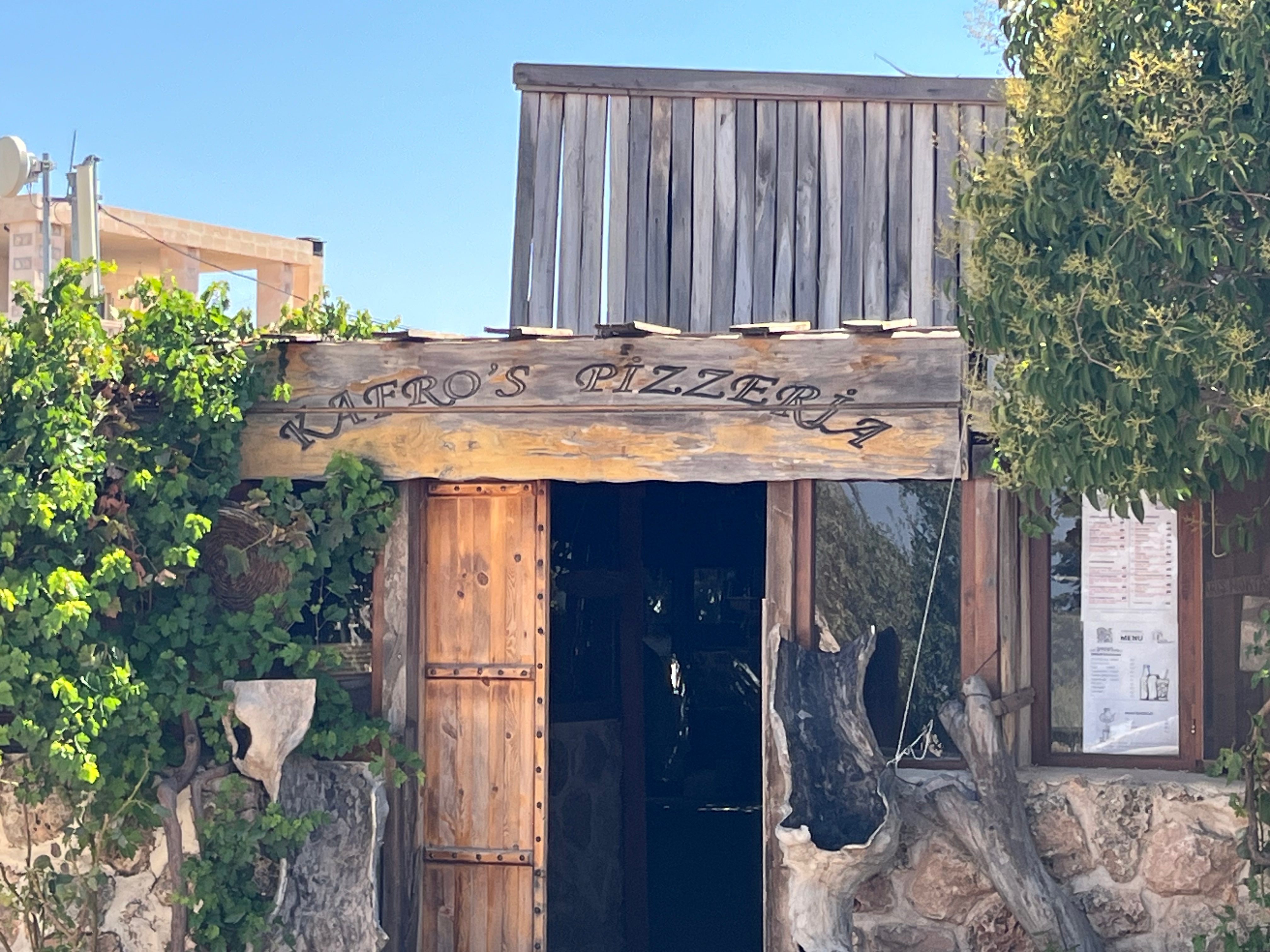 Kafro Pizza saat 12:00’de açılıyor. Ben vardığımda saat 11:00 ve içeride 20 kadar insan çalışıyor. Bana bir kahve yapabilir misiniz dediğimde özür dileyip çalışmaya devam ettiler. Eskiden rehberlik yaptığım için yöredeki tek düzgün lokantanın ne kadar yoğun olabileceğini tahmin etmeye çalışmakla birlikte içeriyi gezerken tıpkı hamburgerci gibi bölünmüş sıralarda “burada sipariş verin” tabelasını görünce şaşırmadım değil. Sipariş verdiğiniz nokta ile pizzanızı alacağınız nokta arasında kıvrılarak ilerleyen 20m var. Buradan yola çıkarak hesaplamalarıma göre 10-15 turist otobüsü geliyordur buraya. Eskiden olsa 400-600 insan ama şimdi otobüsler de büyük. Ama işin can alıcı yönü hepsi yaklaşık aynı saatte geliyor.