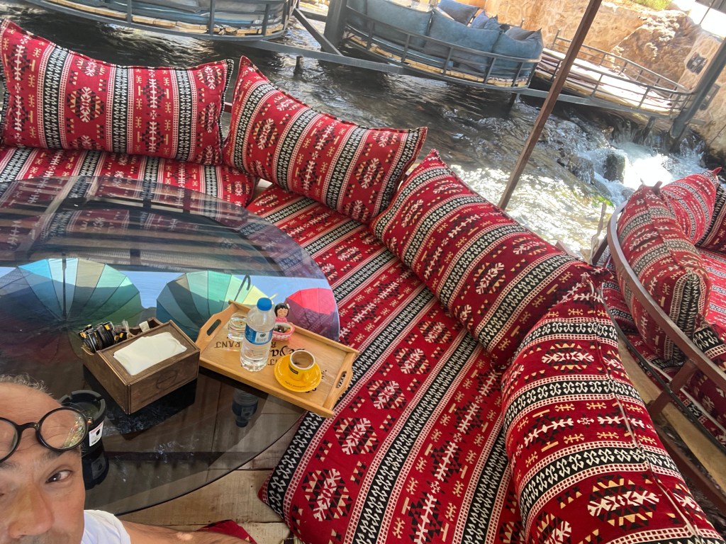 Yeme iştahımı yutkunup “delete” ettikten sonra kahve ve şeftali suyu ile idare ediyorum. Yukarıda görülen sedirler Beyazsu’nun üzerine yapılmış ve altınızdan çay akıyor. Hatta bi de yüzülecek yer yapılmış ama sanırım sadece çocuklar için. Zira bölgenin kültürü herkesin bir arada yüzmesine müsait değil.