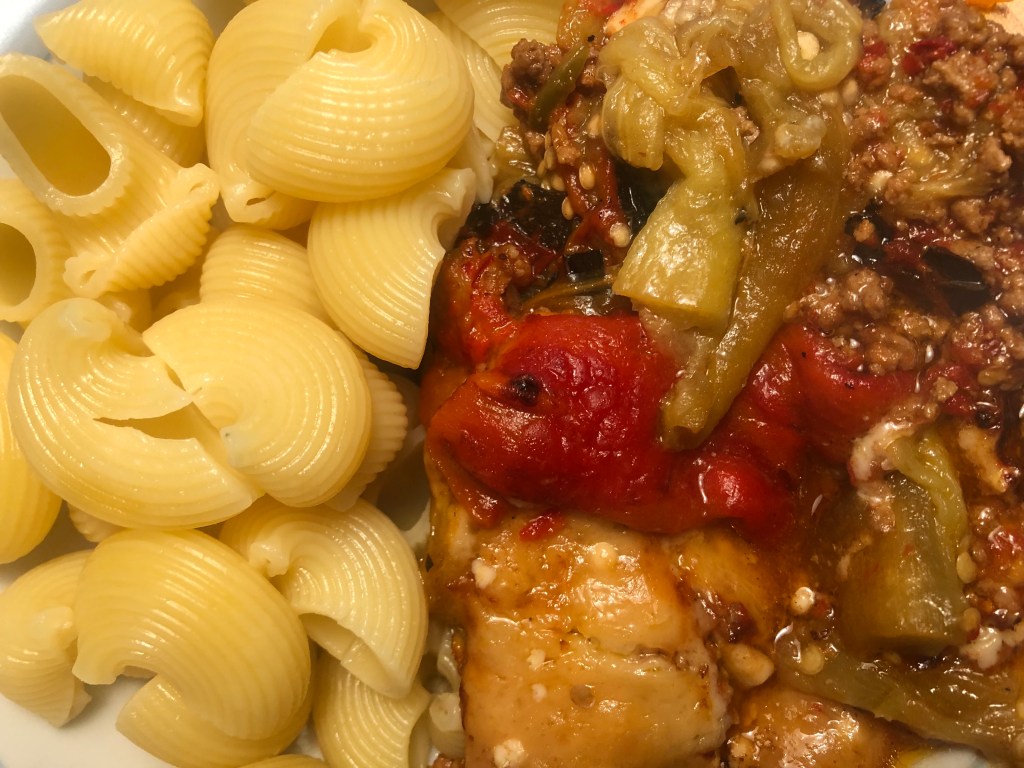 Makarna: Barilla’nın Tortiglioni ve Gnocchi türleri ile Ankara’nın Burgu’su (Fusilli) bu yemekle harika gider. Hangisini seçerseniz önerilenden 1 dakika az pişiriniz. Ama makarna yerine ıslak bulgur (meyhane pilavı) da çok yakışacaktır, hatta pirinç (Basmati) de yapılabilir, damak tadına göre. Tarifini diğer anlatıda bulabilirsiniz